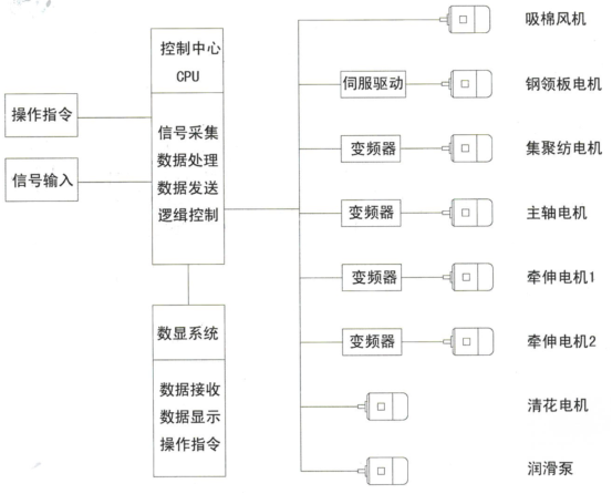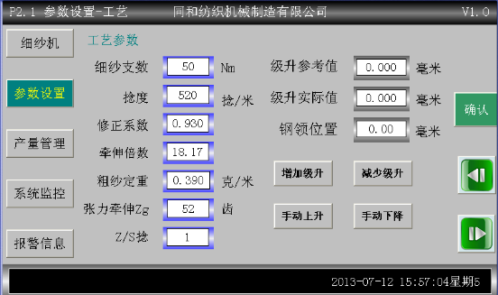 电子牵伸、电子升降的原理是采用现代化数字控制与电子技术,来实现对细纱机的运动控制,改变原来牵伸传动、捻度传动、升降传动,锭子传动由一个主电机来控制的传统模式,这种机械传动的优点是机械同步好,采用电子牵伸、电子升降控制模式,就是将传统的一电机传动改为多电机单独传动模式,即是将牵伸、捻度、钢领板升降、锭子传动分开单独传动,由PLC控制多个变频或伺服电机,通过编码器传感技术进行闭环控制来实现,确保细纱机在整个运转过程中的牵伸比同步、捻度比同步。经多家毛纺用户使用实践证明“数控一代”毛纺细纱机纺纱支数、捻度等工艺指标均优于机械式细纱机。由于单电机分别传动,传动效率、牵伸效率均高于机械式细纱机,牵伸比、捻度比恒定,牵伸、捻度可以实现大范围的无级精细变换,机械式细纱机是无法达到的,因而也实现了节能降耗。经常州三毛同品种、同工艺纺纱对比试验测定:新机比B583、EJ519节能5~8%,噪音降低5~8dBa,达到了节能、环保要求。
