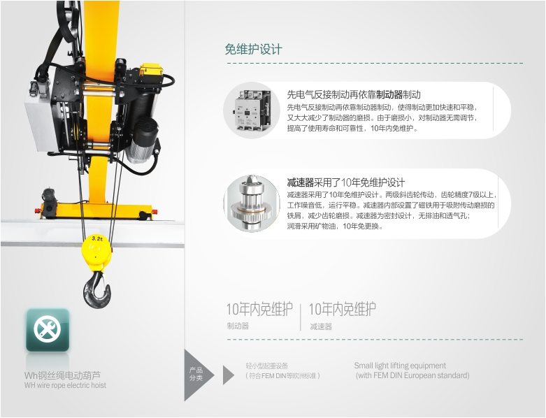节能环 保等优势。电动葫芦应用8项专利技术,零部件采用模块化制造工艺,通用性强,免维护率高,易损件少。